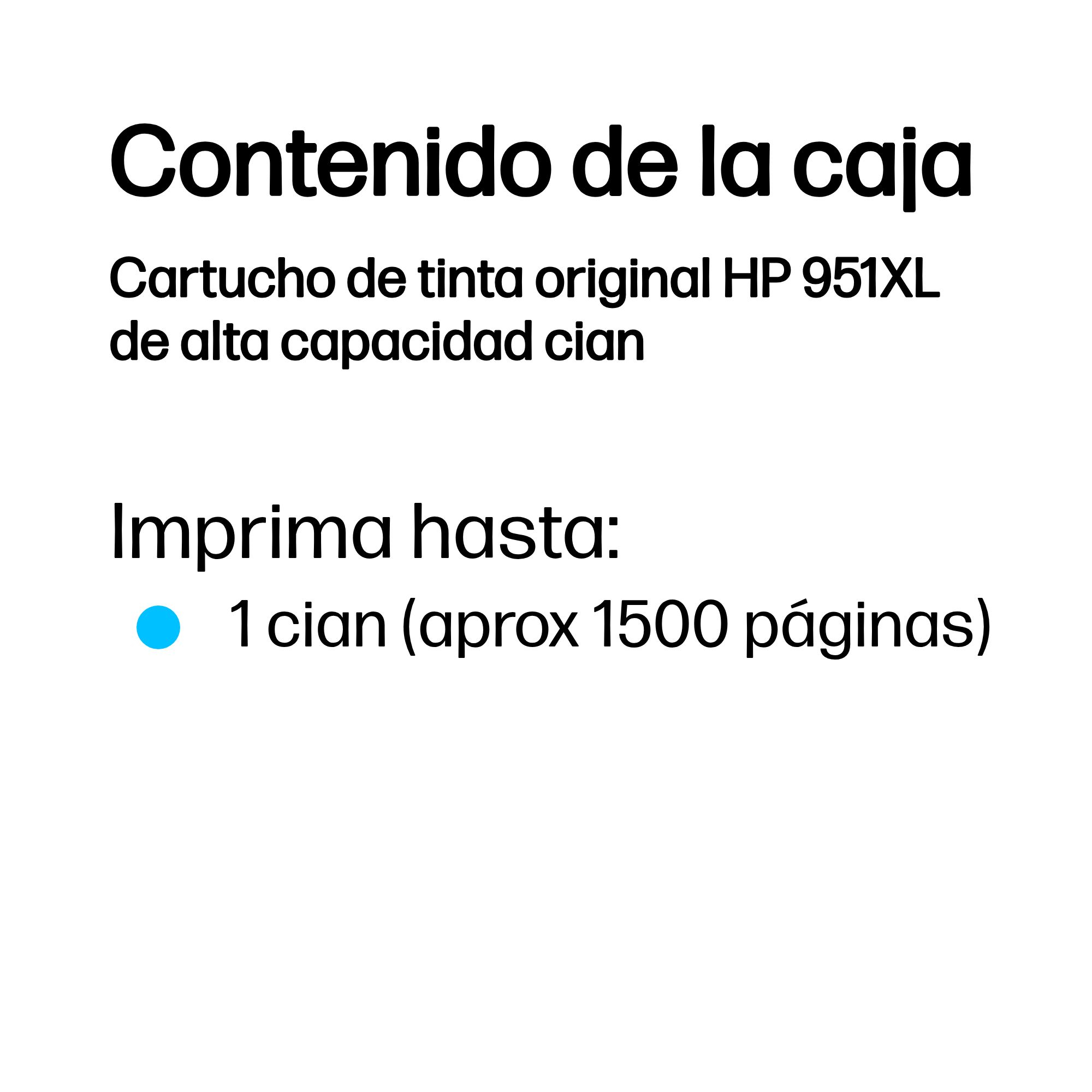 | Compatibilidad | Los cartuchos de Tinta HP 951 funcionan con: HP OfficeJet Pro 276, 8100, 8600, 8610, 8620, 8640 |